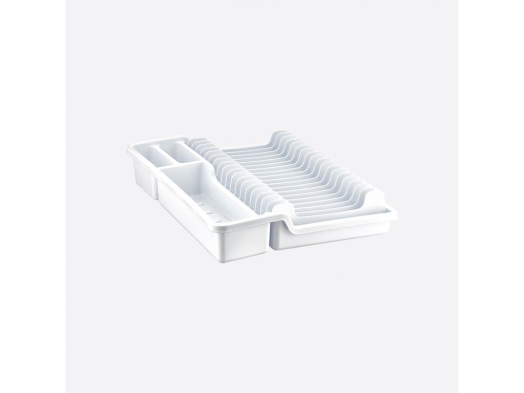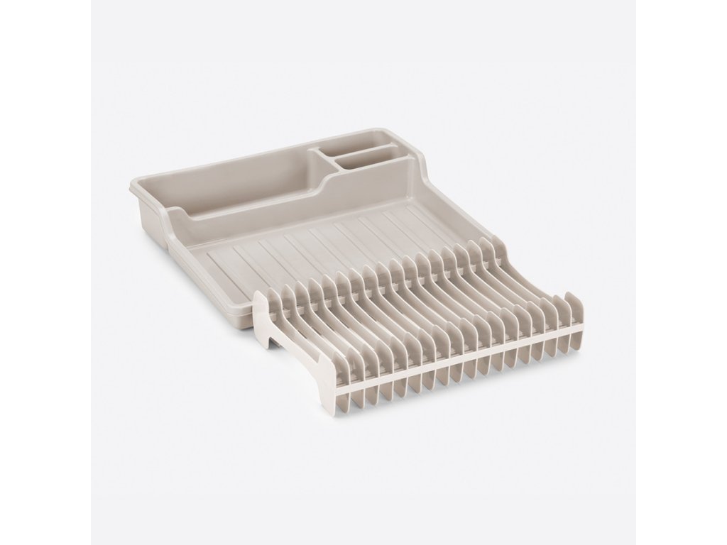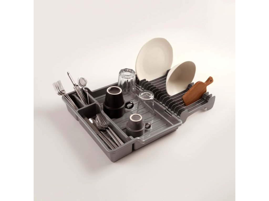 A csepegtetőtálca megelőzi a víz kifolyását a pultra, a különálló evőeszköztartó pedig gondoskodik a rendezettségről. A kihajtható kialakításnak köszönhetően a szárító igény szerint bővíthető, így több edény is elfér rajta.
