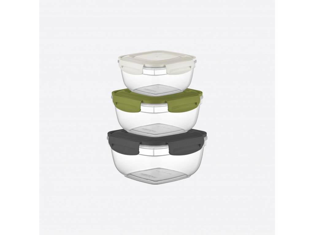 Ételtároló szett 3 részes – Fresh Box 0,5L / 0,9L / 1,5L 3 darabos, különböző méretű frissen tartó doboz szett színes tetőkkel.
