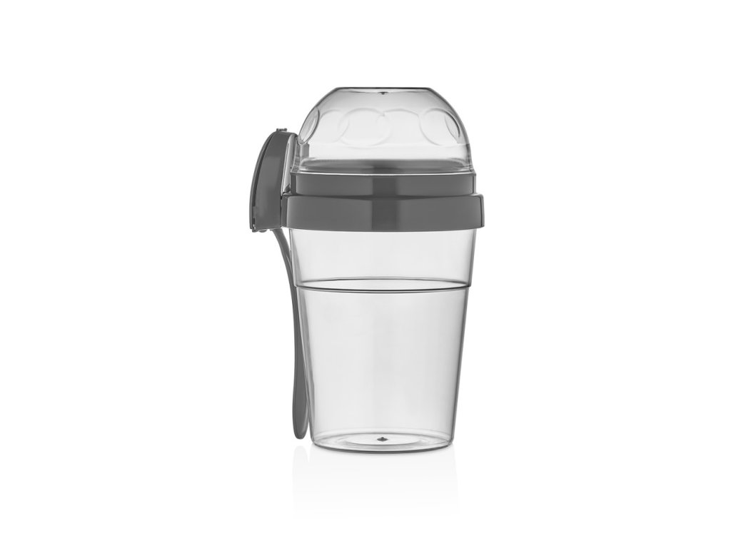 A felső rekesz jól zárható, a kanalat pedig a pohár oldalára rögzítheted, hogy mindig kéznél legyen. A pohár teljesen BPA-mentes műanyagból készült, így biztonságos választás az egész család számára. Kompakt mérete révén bárhová magaddal viheted – legyen szó munkáról, iskoláról vagy utazásról.