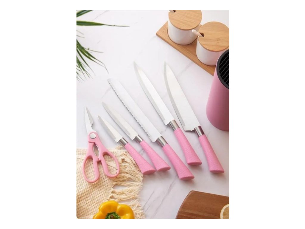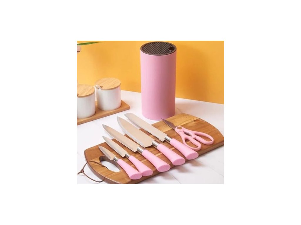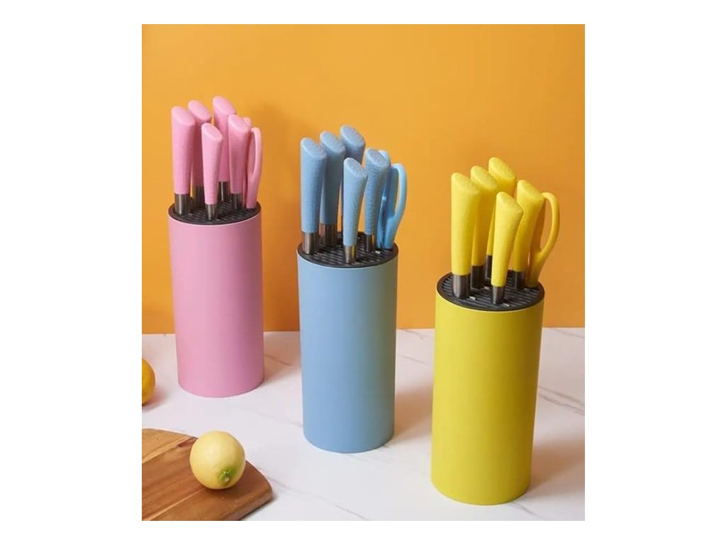 A készlet 5 különböző méretű kést, egy ollót és egy henger alakú tárolót tartalmaz.