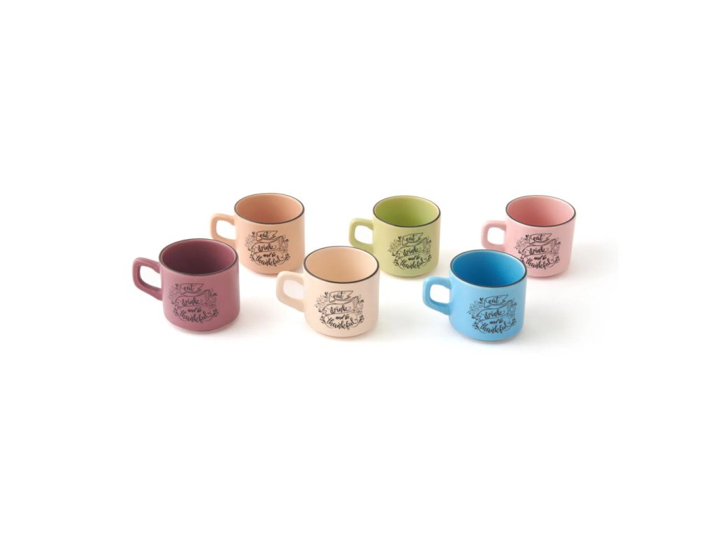 A Motto kerámia kávéscsésze szett egyesíti a praktikumot és a vidám színvilágot. A 6 db különböző színű csésze mindegyikén elegáns, feliratos minta található, ami egyedi hangulatot kölcsönöz a kávézás pillanataiban.