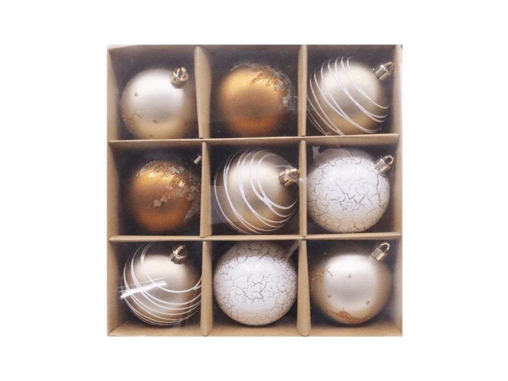 A szettben minden gömb más stílusban készült: van köztük matt, fényes, repedezett, csíkozott és aranyfoltos kivitel is.