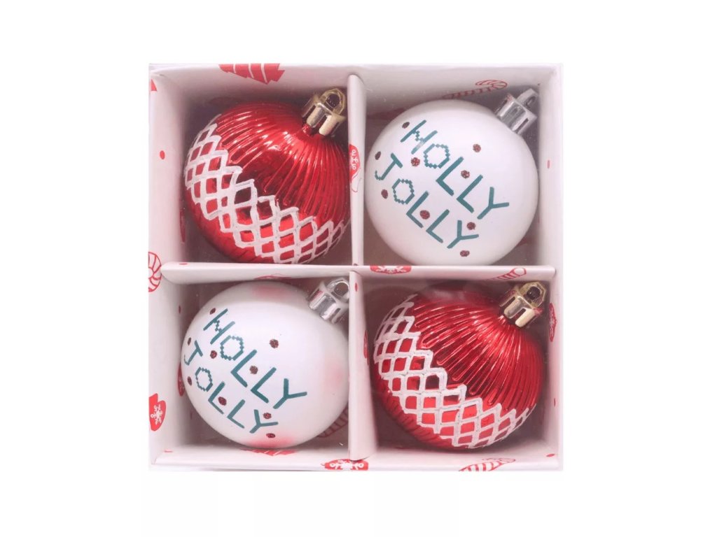 A készlet kétféle mintát tartalmaz: fényes piros rácsmintás gömböket és fehér, „HOLLY JOLLY” feliratú díszeket.
