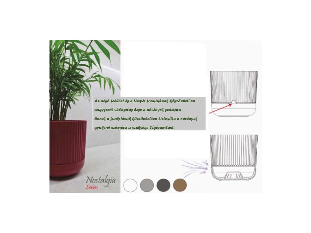 A Kaspó Nostalgia alátéttel 2,8L praktikus és esztétikus megoldás otthoni vagy irodai növények elhelyezésére. A 16×16×15 cm-es méret megfelelő teret biztosít a gyökérzet fejlődéséhez, miközben kompakt kialakítása miatt könnyen elhelyezhető polcon, ablakpárkányon vagy kisebb bútorokon.