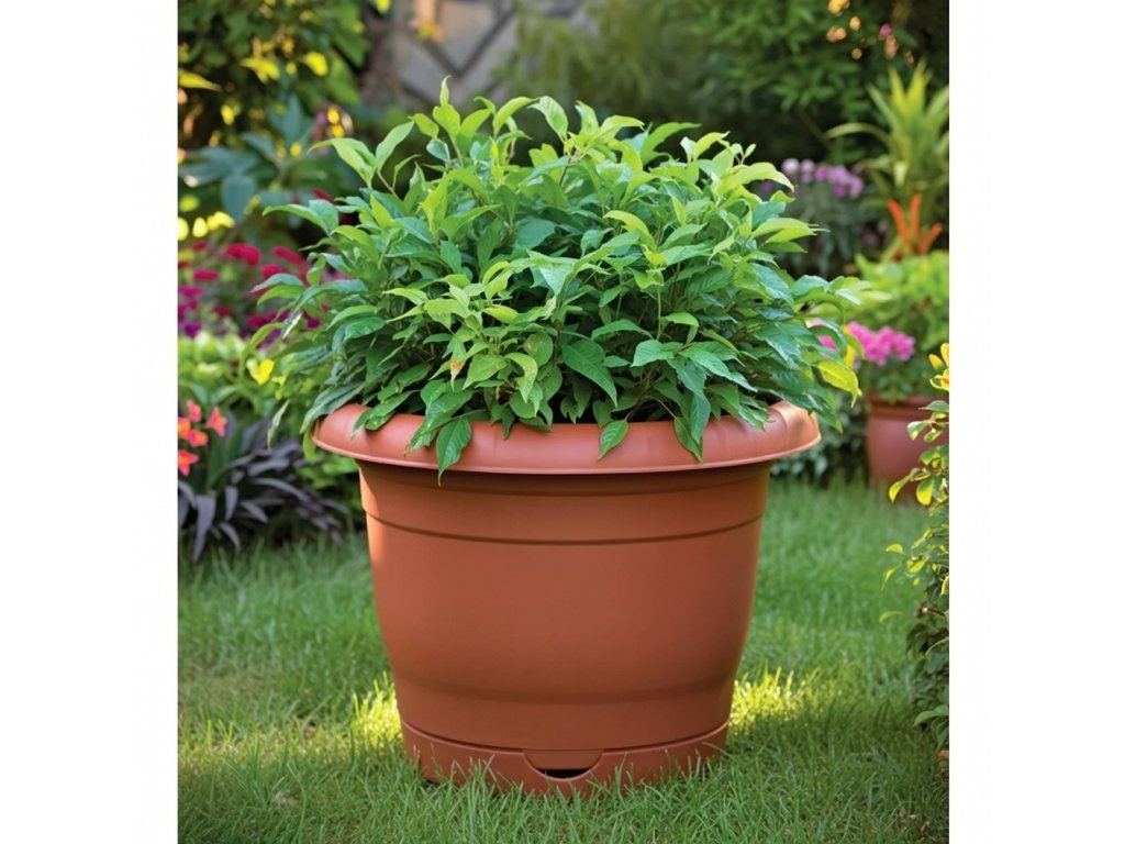 A 42 literes virágcserép alátéttel kifejezetten nagyobb növények stabil nevelésére készült. A 56×40 cm-es méret elegendő helyet biztosít a gyökérzet fejlődéséhez, így bokrok, nagyobb dísznövények vagy kisebb fák ültetésére is alkalmas.