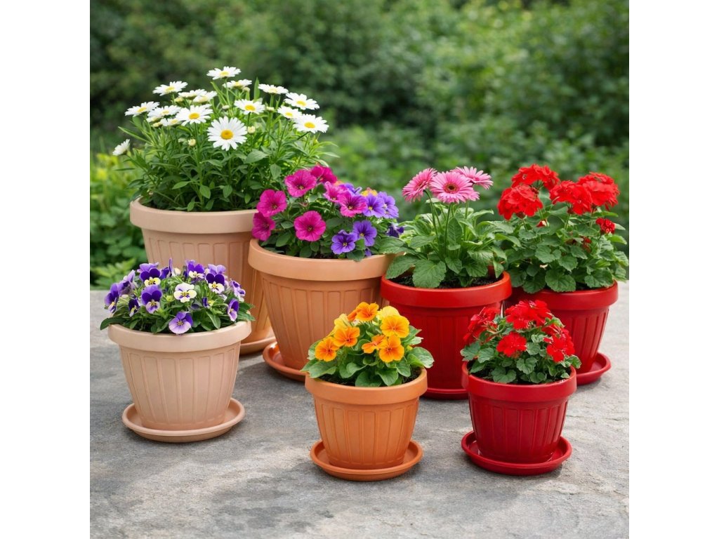 Közepes méretű műanyag virágedény alátéttel, szobanövények és kisebb balkonvirágok számára.