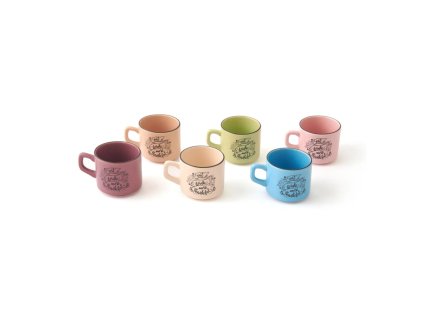 6 db-os kerámia kávéscsésze szett vidám vegyes színekben, elegáns feliratos mintával – stílusos választás mindennapi kávézáshoz.