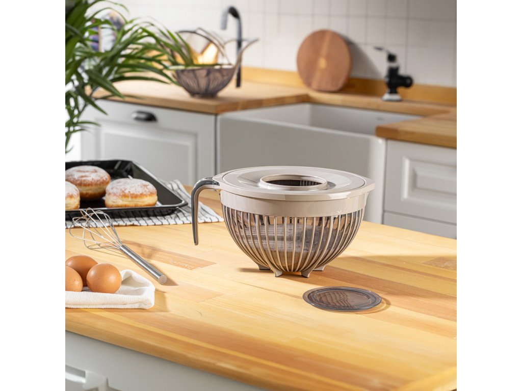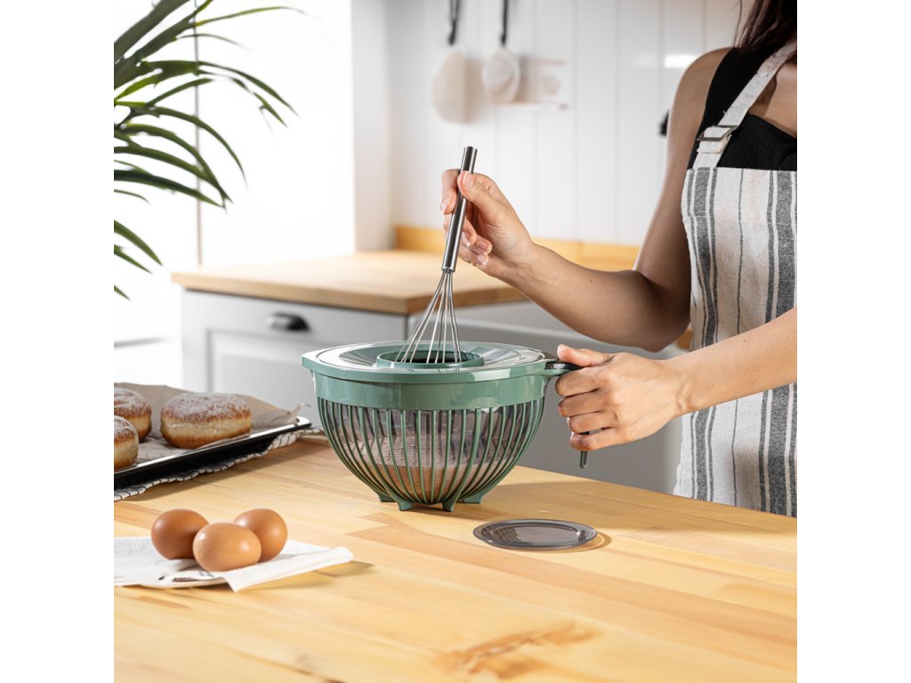 A 3 literes keverőtál fröccsenésgátló tetővel tökéletes választás tészták, krémek, habok vagy egyéb hozzávalók összekeveréséhez. A fedélben található keverőnyílásnak köszönhetően keverés közben nem fröccsen ki az alapanyag, így a konyhapult tiszta marad.