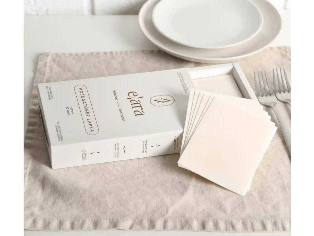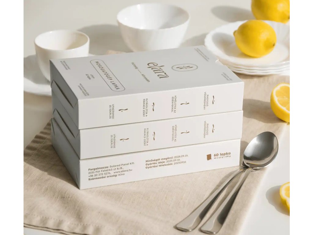Használata rendkívül egyszerű: száraz kézzel vegyél ki egy lapkát a dobozból, helyezd a mosogatógép adagolójába, csukd be az adagolót, majd indítsd el a gépet a megszokott módon. Nincs méricskélés, nincs kiömlő folyadék – csak egy letisztult rutin.